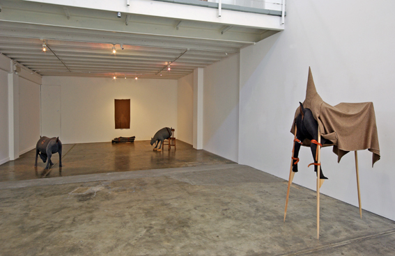 The mystification of death and our emotional responses to it, forms the conceptual realm of my practice. While the afterlife, the occult, Satanism and witchcraft have been recurring themes, the mythologised devil, often represented as a goat forms the starting point for this body of work. The work in Damn your eyes extrapolates the form of the goat into bawdy and bizarre configurations suggestive of rituals, unnatural acts and mutations and thus subjects it to quiet acts of malice and butchery. Despite the ‘sinister’ overtones, humour is never far from my mind and I aim to tread a line between the macabre and the comical, perhaps erring more on the side of a visual pun or cruel joke. In Booth an overt sexual allusion is present as the half priest, half witch-like cloak and hat positions the face and the arse end of a goat together in a lewd union.