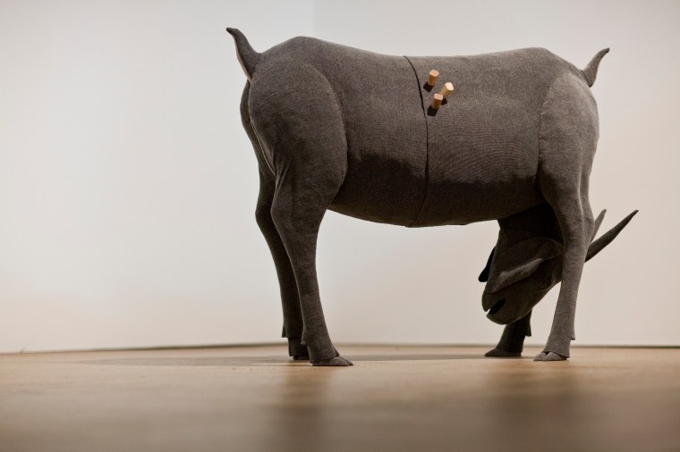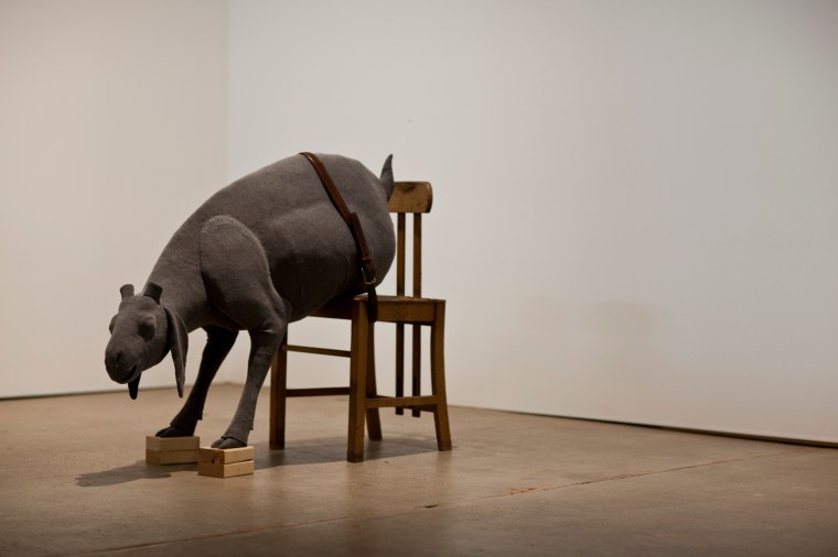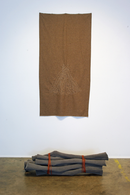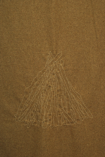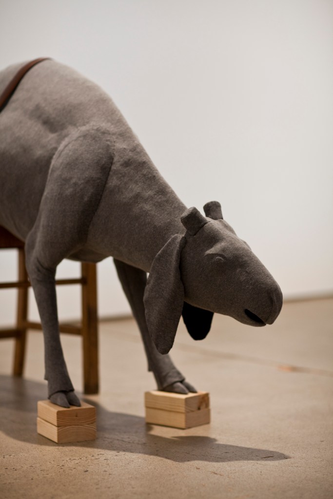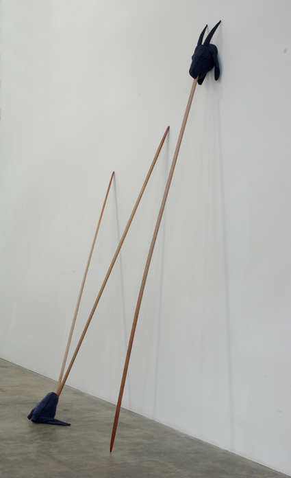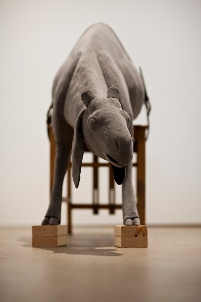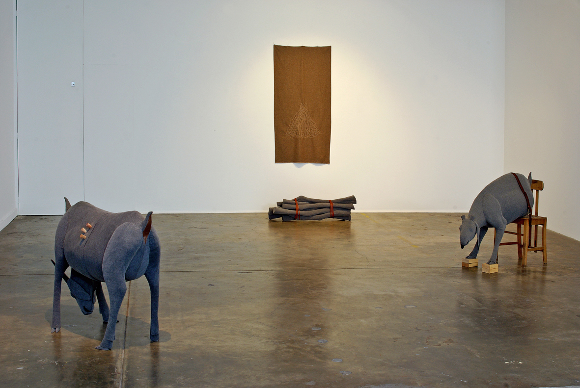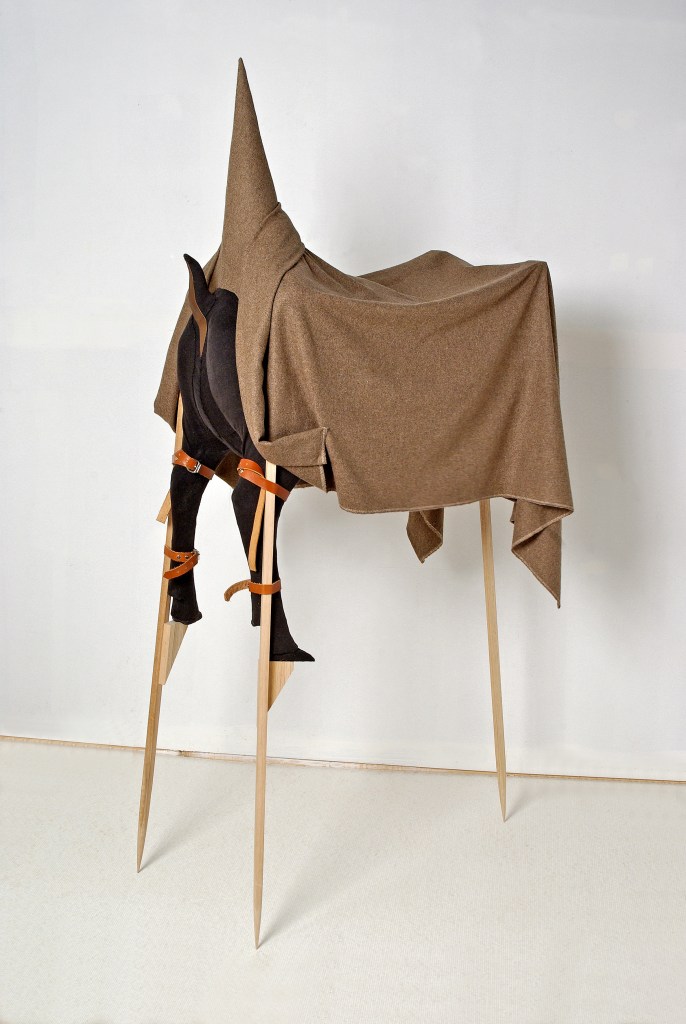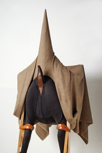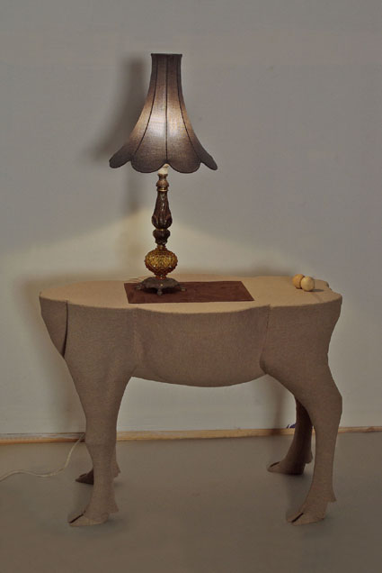 In these composite forms fabric becomes a signifier, denoting animal parts; hence a lampshade covering seems more skin-like and a kindle of firewood is suggestive of both branch and limb. The works as a whole attempt to evoke both the domestic and the barbaric, suggesting a world where firewood could easily incinerate a heretic, or simply light a home fire. Ultimately, it is this push and pull of gentility and brutality that both spurs me on and stays my hand.