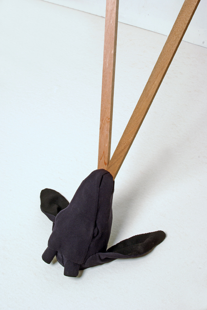 The game of substituting parts becomes a process of material surgery. Using found or fabricated objects in lieu of body parts I become a sort of butcher, slicing off bits deemed irrelevant or redundant. A lamp for a head, a tripod box for legs and body, skewers for tongues – these are all in a state of material make-believe – mimicking the thing they replace yet still retaining their authority and identity as discreet objects.