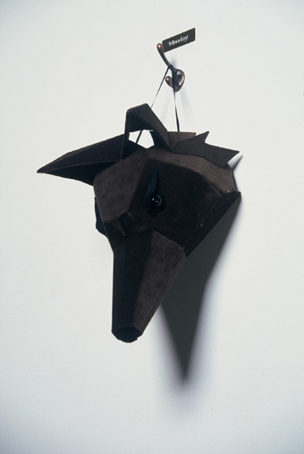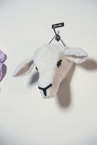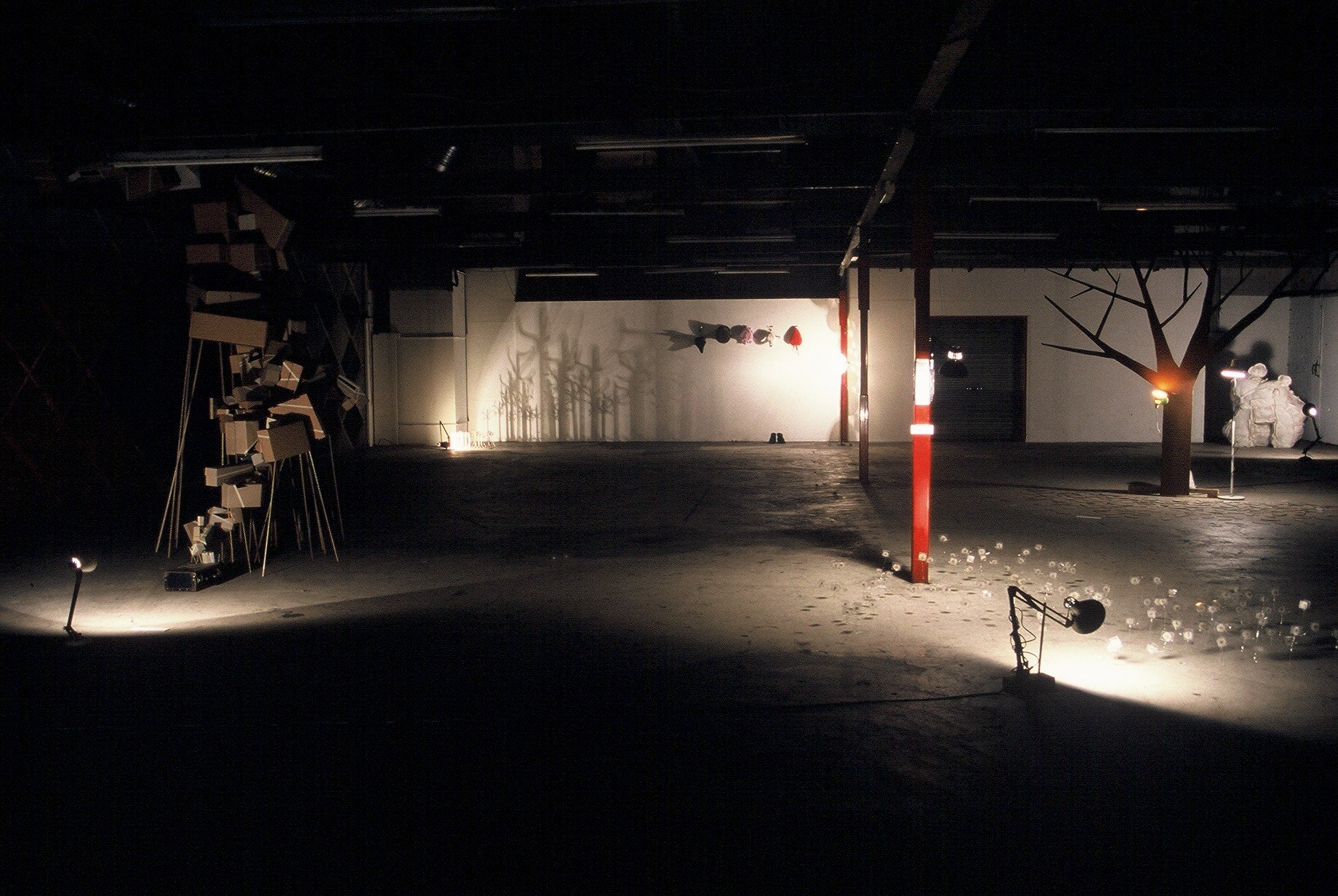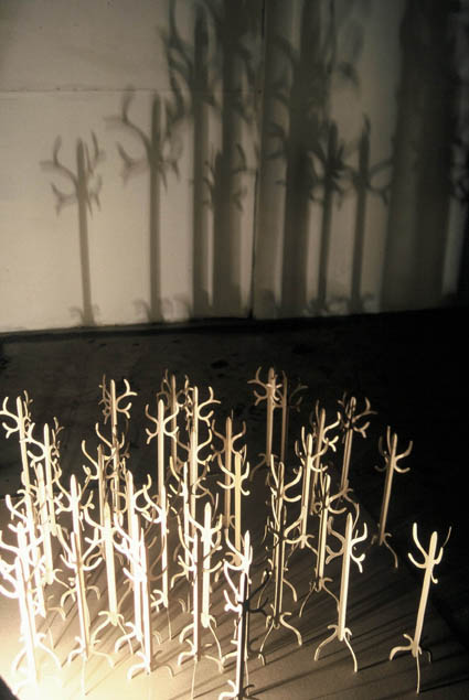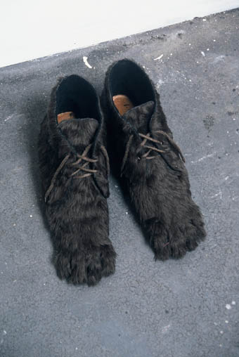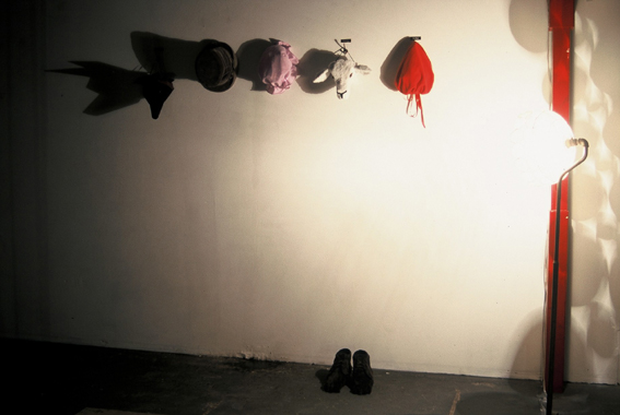 Further Doings, Downtown Art Space …the woods today, fabric, thread, fixings, cardboard, boots, lamp, dimensions variable, 2003 Photographs by Mick Bradley