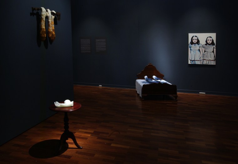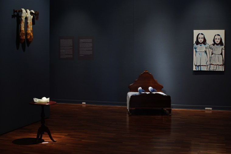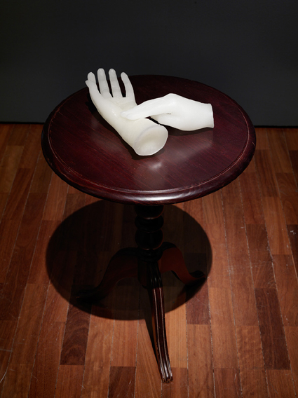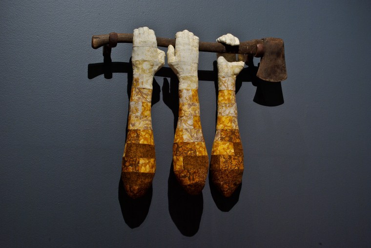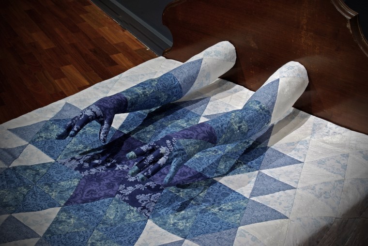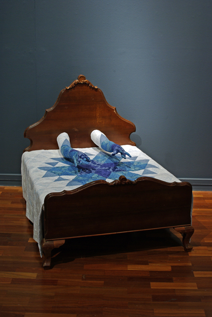 I felt that it was important to approach the lavish, overt language and content of Poe with a more neutral, reserved palette of materials. In this way, works referring to such things as severed limbs, axe murderers and bodies rising from their death bed are tempered with floral fabrics and patchwork quilting techniques.