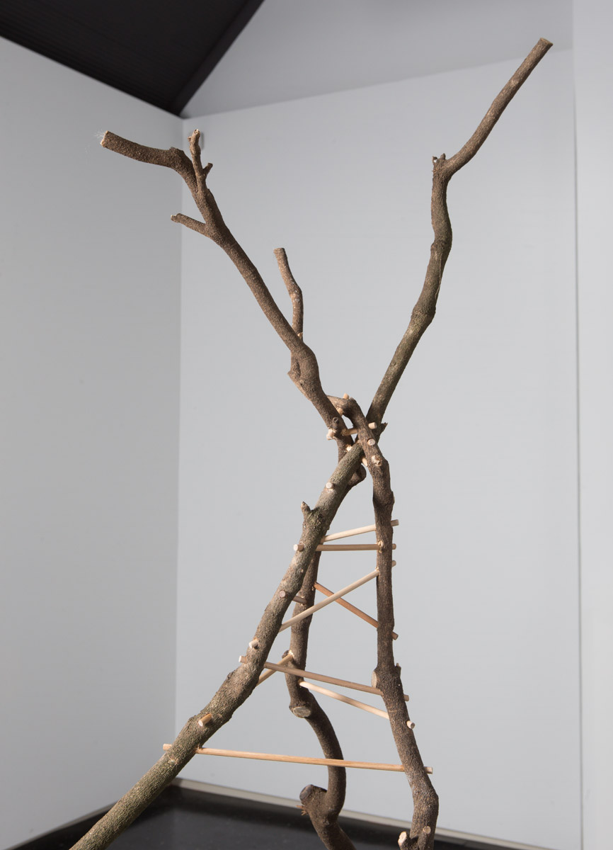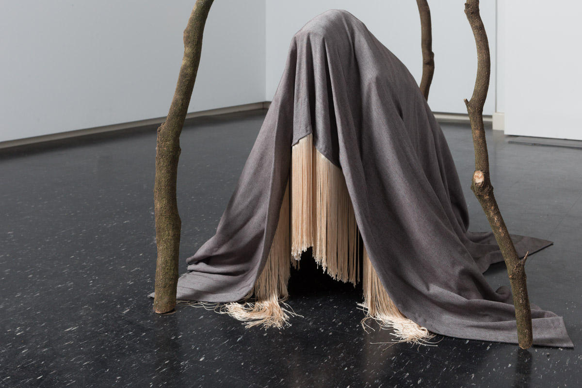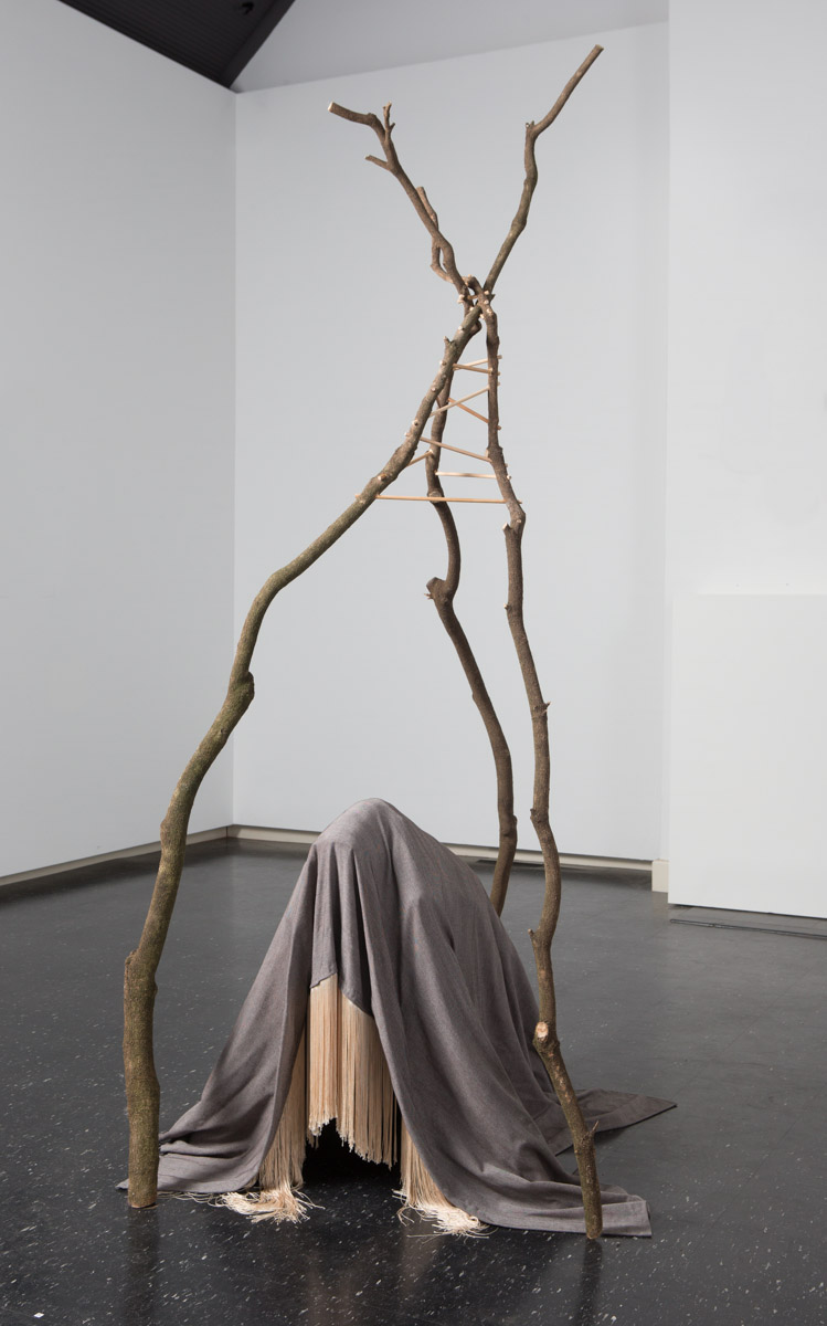 He did not stay, timber, branches, fabric, tassels, thread, flywire, fibreglass, 250 x 120 x 120cm, 2013
