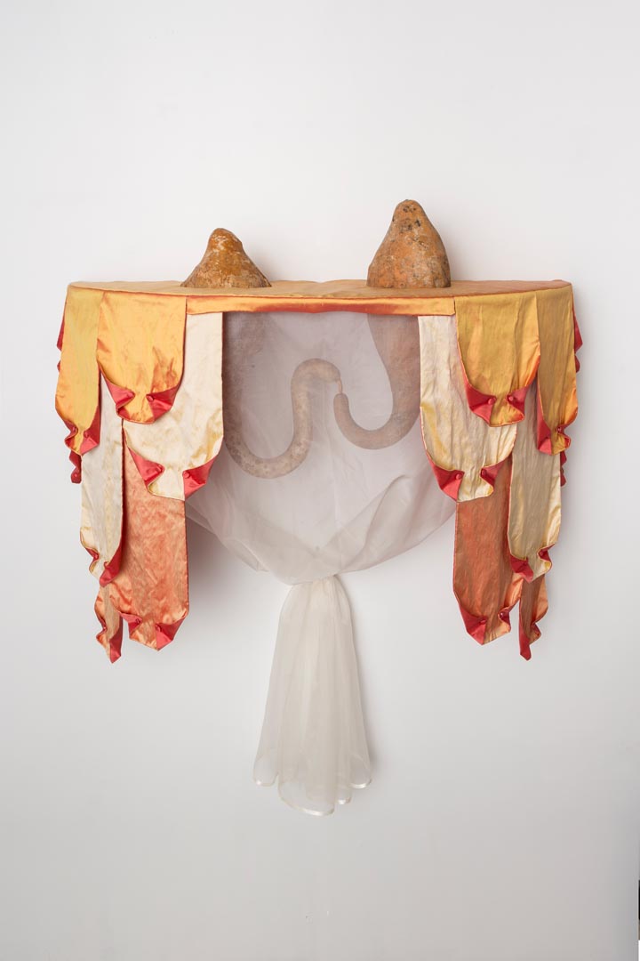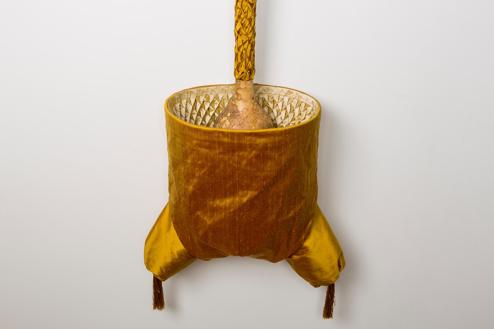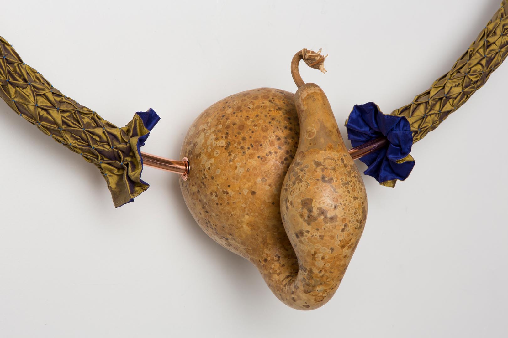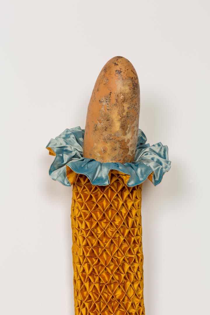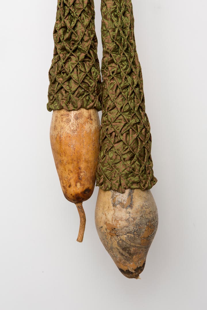 Like Rabelais, Robinson invokes the carnivalesque by means of grotesque realism in The Song of Master John Goodfellow. Overtly phallic gourds are at once concealed and revealed in an intricately smocked covering or an elaborately collared prophylactic sheath. And in a masterful act of inversion, two communing gourds are presented within an elegant stage-like structure – their top ends partially hidden from the viewer in an act of modesty, their copulating nether regions exposed for all to see. By deploying devices of corporeal cunning, Robinson imbues inanimate objects with anthropomorphic qualities.