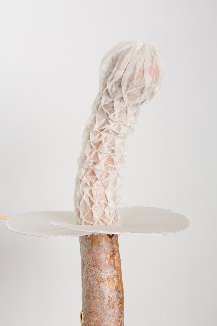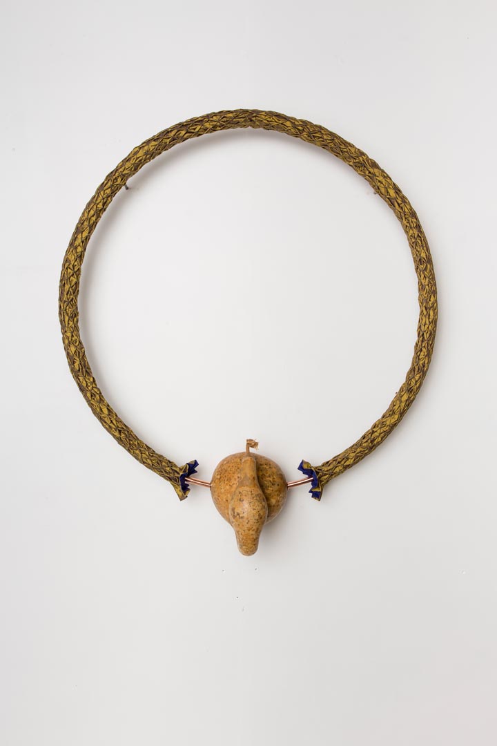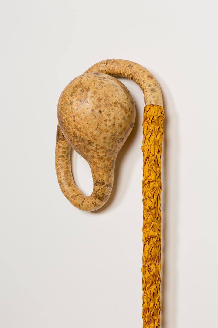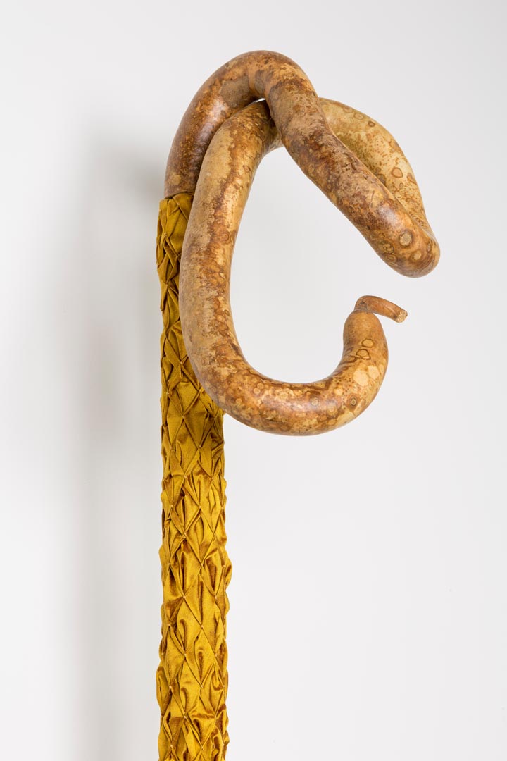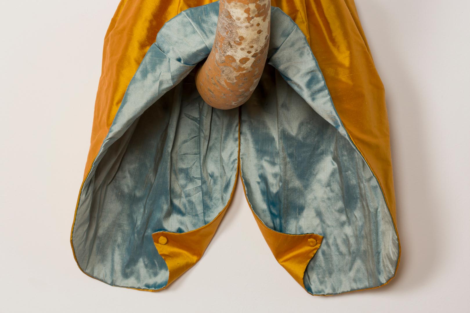 Like Rabelais, Robinson invokes the carnivalesque by means of grotesque realism in The Song of Master John Goodfellow. Overtly phallic gourds are at once concealed and revealed in an intricately smocked covering or an elaborately collared prophylactic sheath. And in a masterful act of inversion, two communing gourds are presented within an elegant stage-like structure – their top ends partially hidden from the viewer in an act of modesty, their copulating nether regions exposed for all to see. By deploying devices of corporeal cunning, Robinson imbues inanimate objects with anthropomorphic qualities.